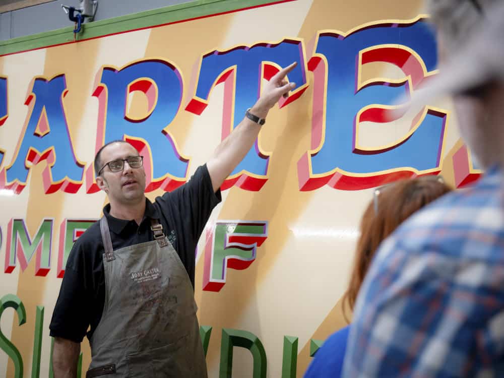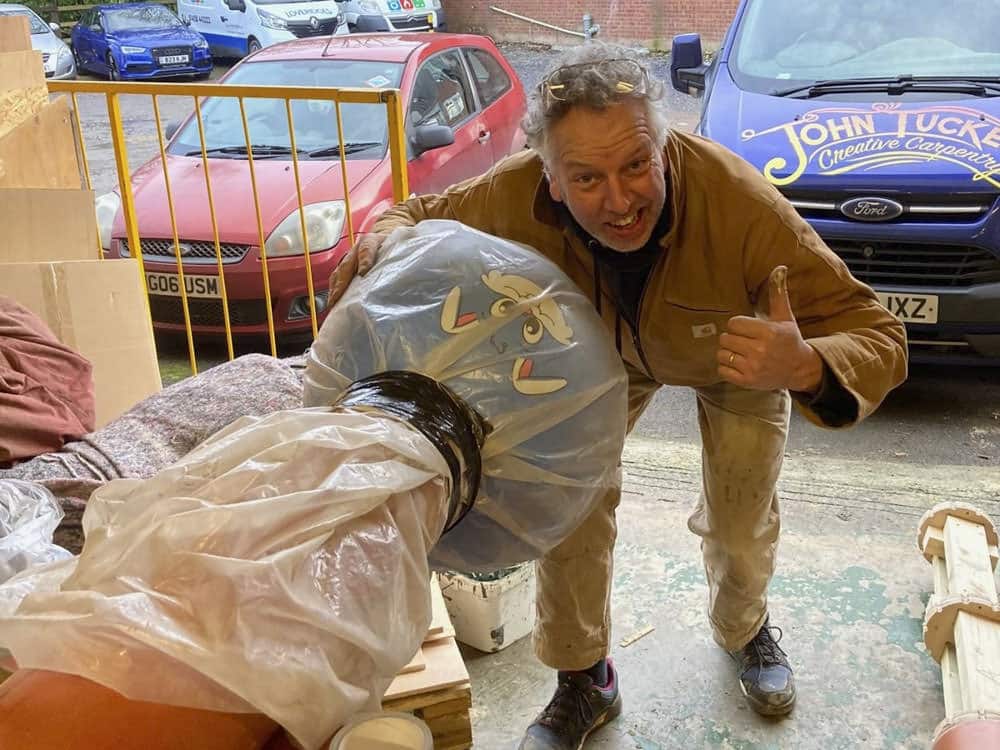 To help raise awareness of traditional signwriting techniques, Joby decided to create supersized signwriting tools to display outside the workshop. There’s a 9-foot by 6-foot palette with giant paint dipper pots big enough to bathe a toddler, a mahl stick (used to lean on when signwriting so you don’t smudge your work) which is over 30 feet long and a paintbrush which is 8 feet long. These will be displayed alongside a 24-foot sign which Joby has been working on for several weeks which features hand painted letters 2 feet high. Joby has been sharing videos of the making of the sign and supersized signwriting tools on social media which have gained a lot of interest. The sign was on display at ground level during the open day as Joby is still working on the lettering.