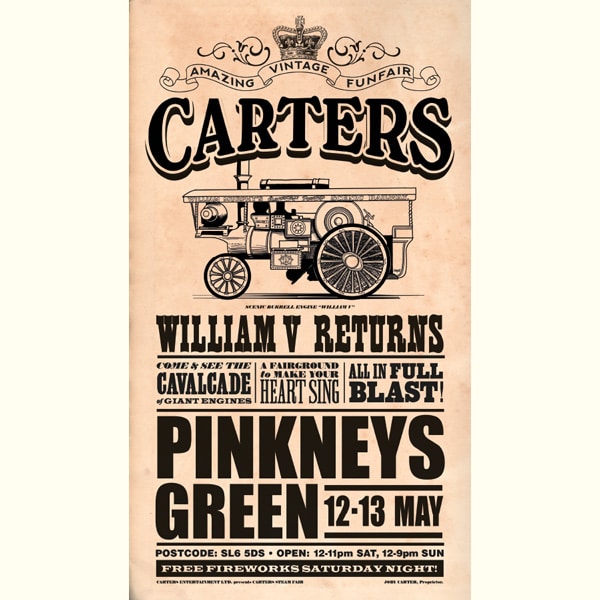 A commemorative poster showcasing Showman’s Engine William V returning to Carters Steam Fair at Pinkneys Green. 605x 345mm, printed on glossy paper. Item is sent in a poster tube ready for framing (frame not included in price). Limited stock available.