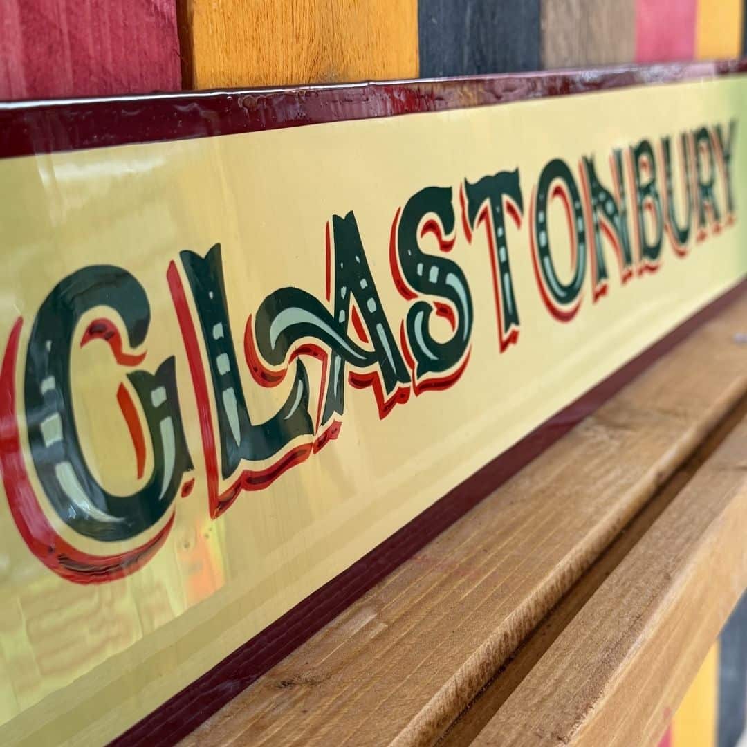 A bold tribute to one Britain’s most iconic places, this hand painted Glastonbury sign brings together traditional signwriting with rich colour and character.