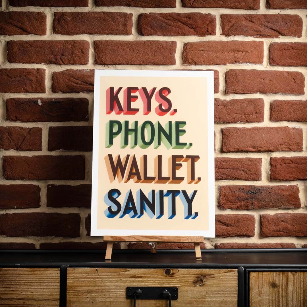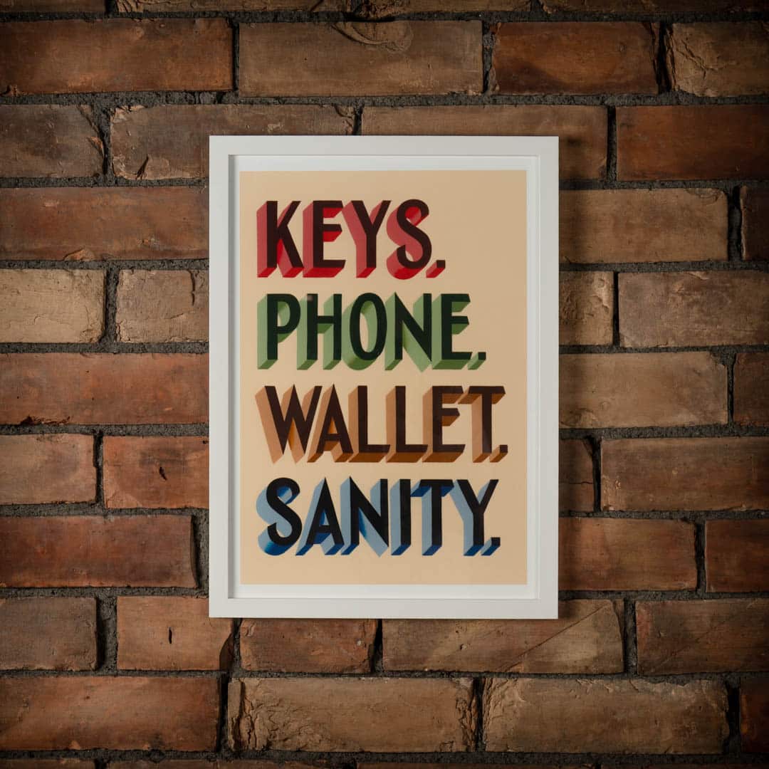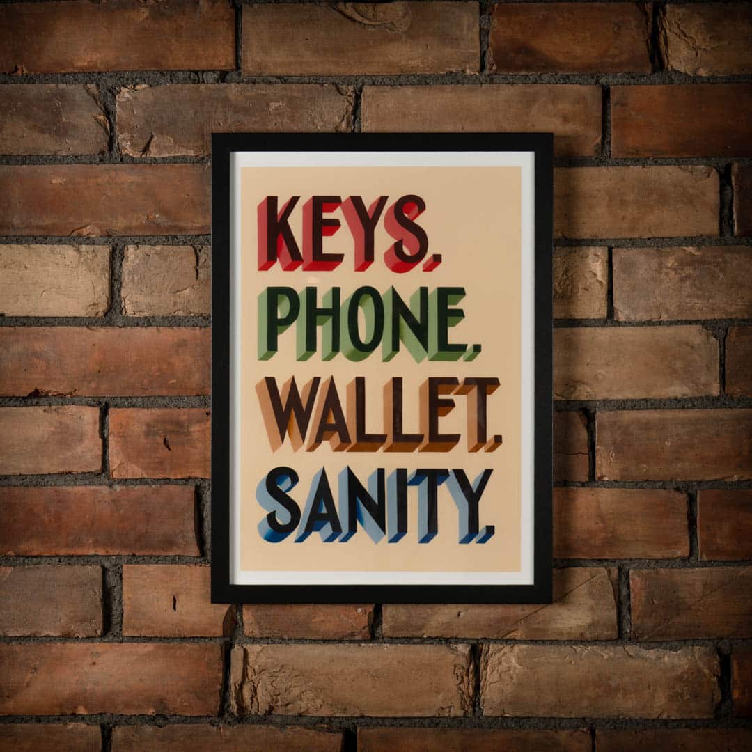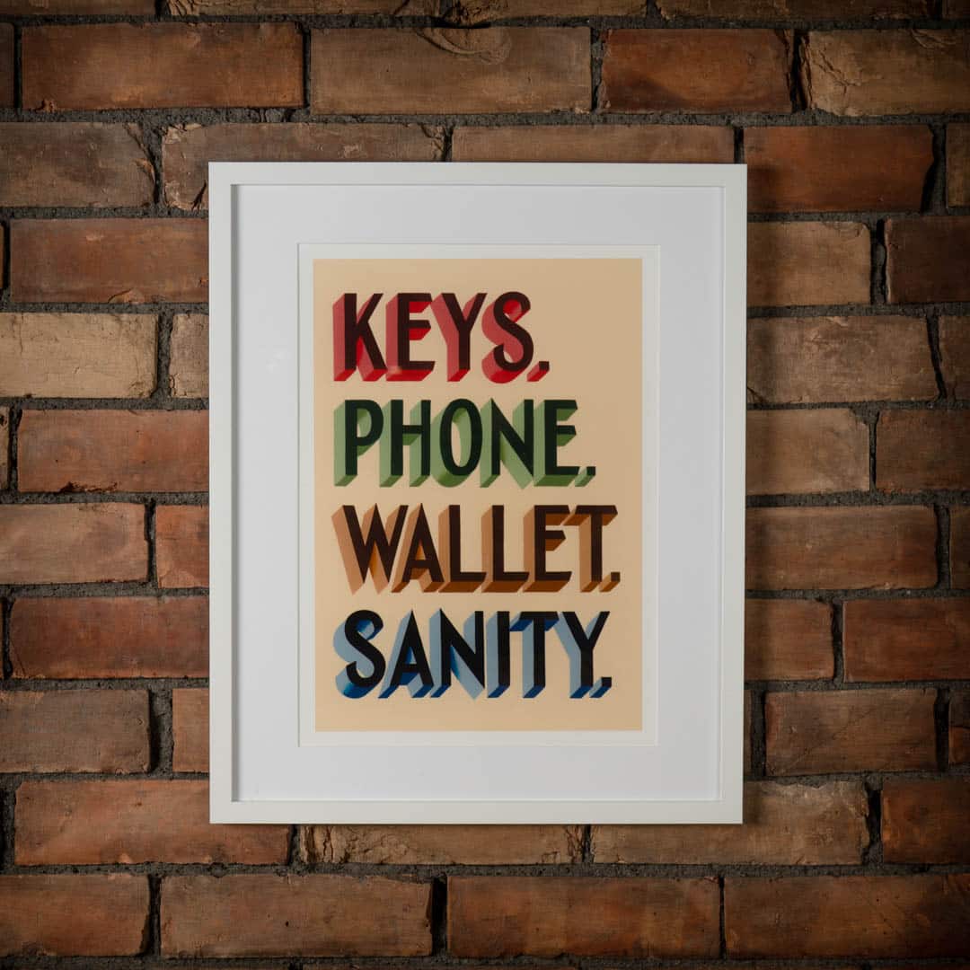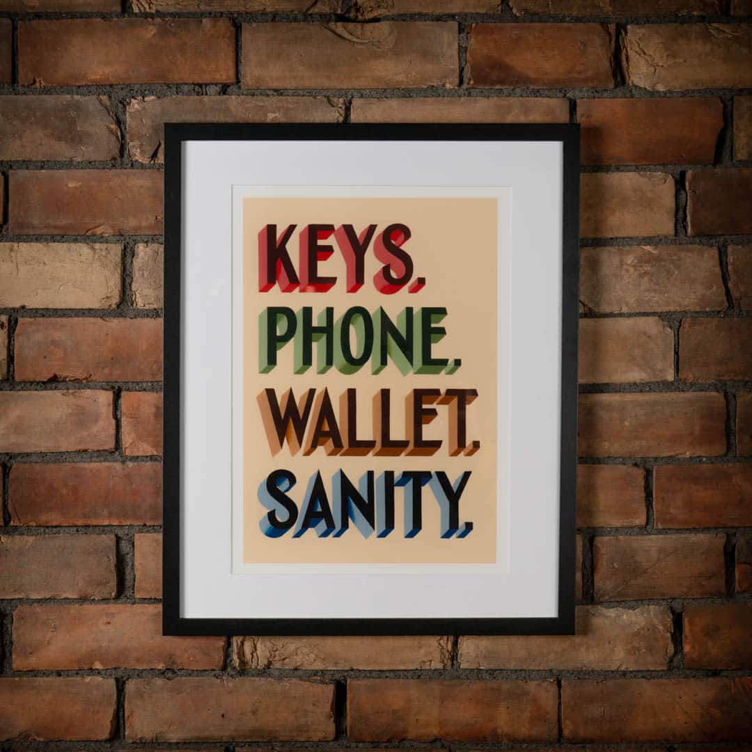 Keys, Wallet, Phone, Sanity is a fine art print of hand painted lettering designed and painted by Joby Carter in his White Waltham workshop using traditional signwriting techniques. There are no computers or shortcuts used in Joby’s signwriting workshop!