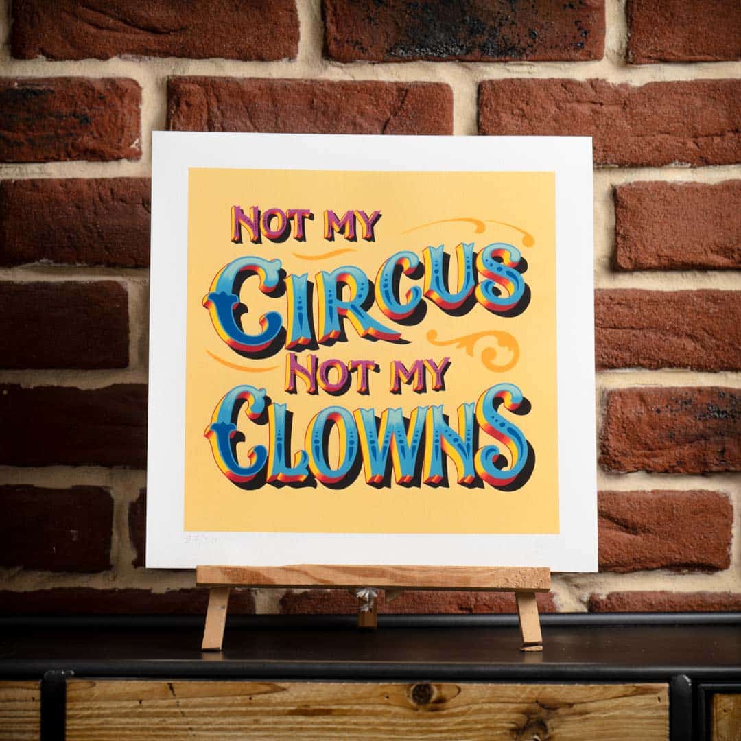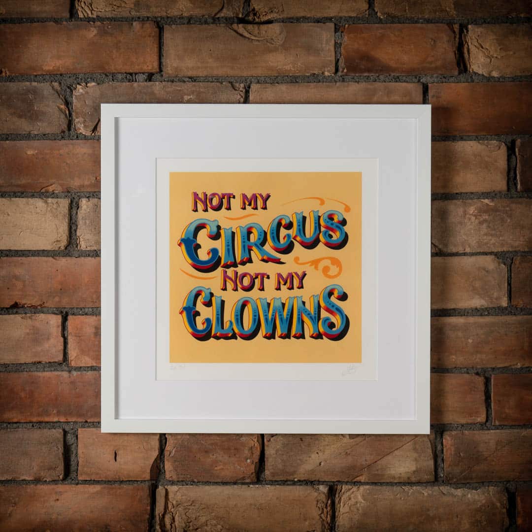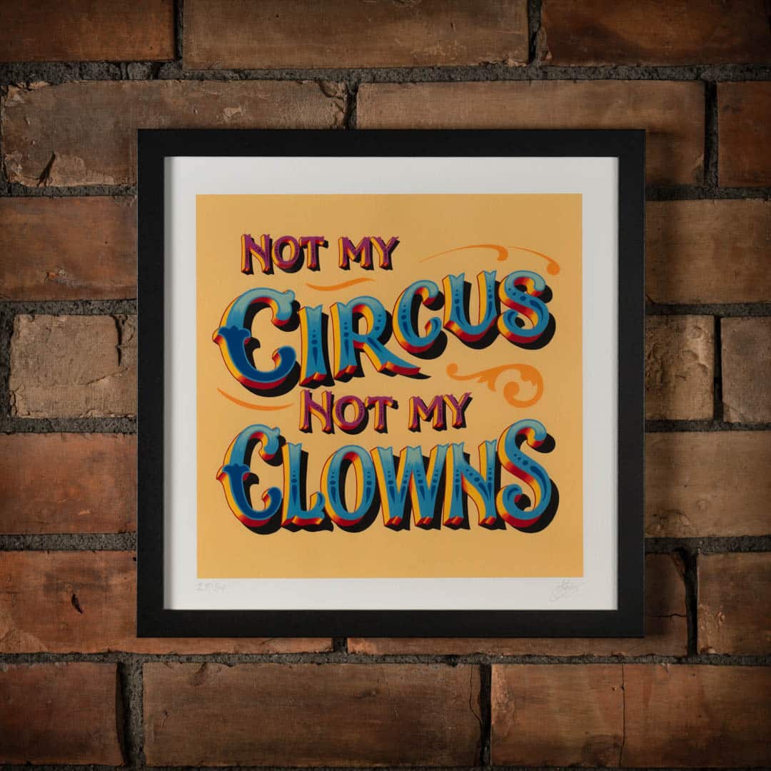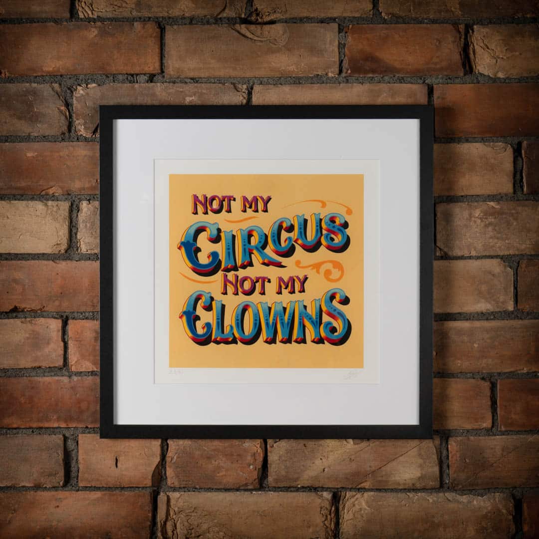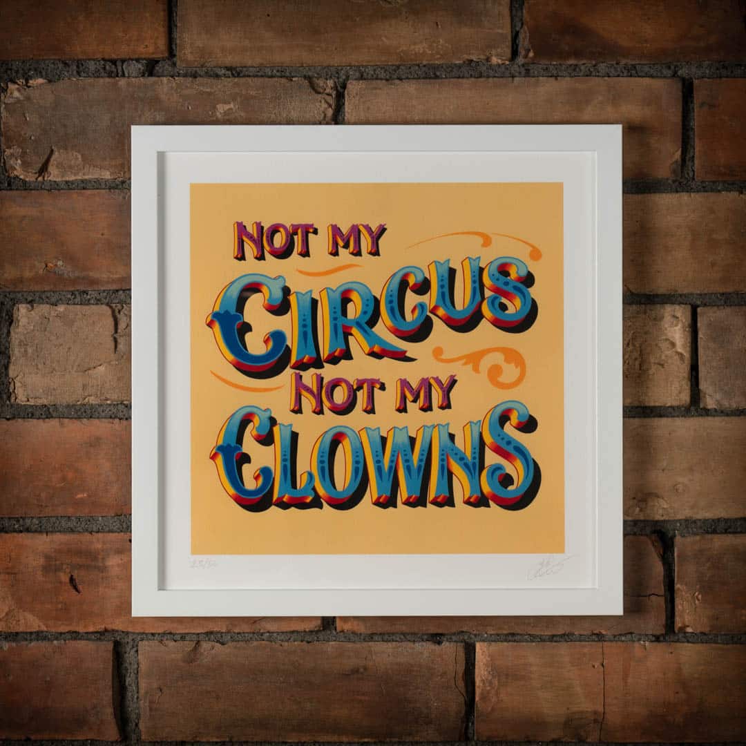 ‘Not my Circus’ is a limited edition fine art print which features hand painted lettering created by Joby Carter in his UK workshop using traditional signwriting techniques. There are no computers or modern shortcuts used by Joby, everything is drawn, painted and embellished by hand in several stages across a week.