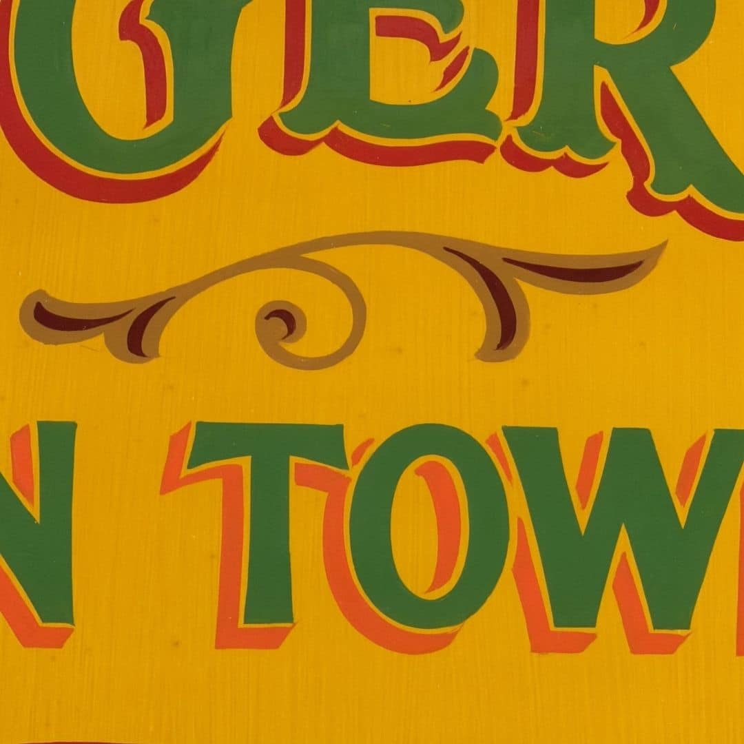 A spirited fairground classic with genuine vintage roots, The Oldest Swinger in Town is a characterful hand painted sign full of nostalgia and humour.