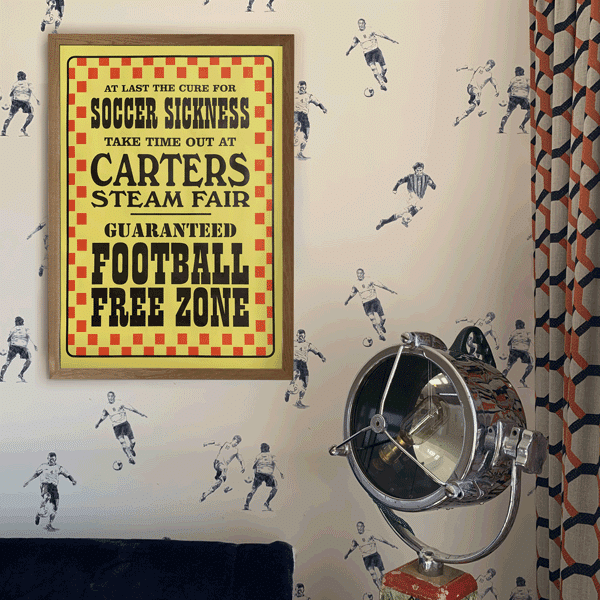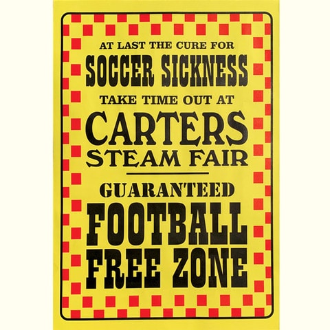 Carters Steam Fair Soccer Sickness limited stock poster designed over 20 years ago by John Carter recently discovered stock. Measuring 520 x 358mm, printed on matt paper. Item is sent in a poster tube ready for framing (frame not included in price). Limited stock available.