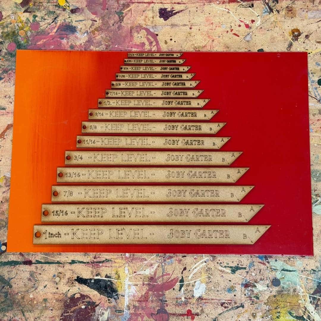 The set includes 15 small wooden batons of varying thickness from 1inch – 1/4 inch with a 45 degree angle at the end. They enable you to use Joby’s ‘triangle trick’ method to measure out your blocks consistently to give you professional results. The wooden batons are also incredibly handy for keeping your widths consistent when laying lettering out