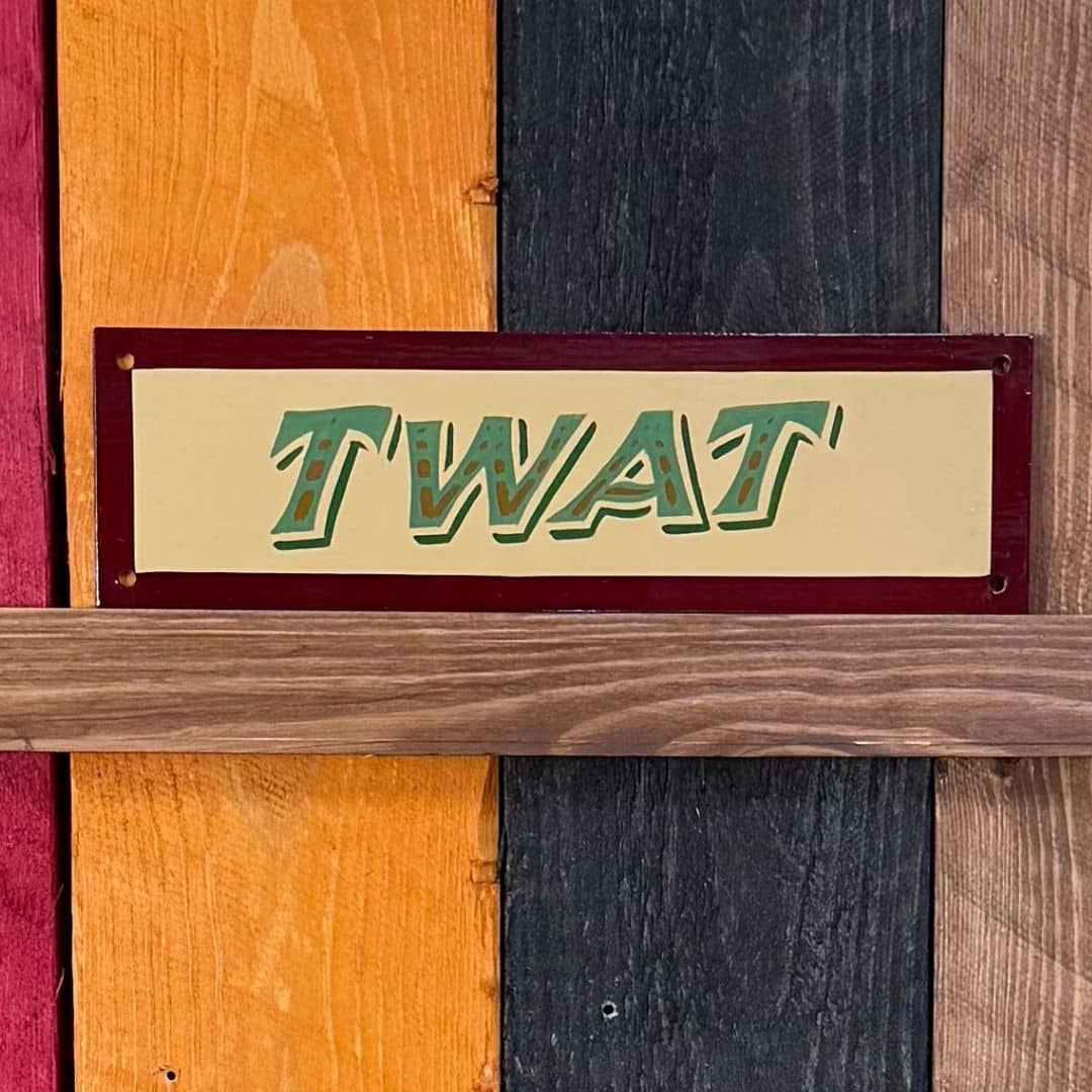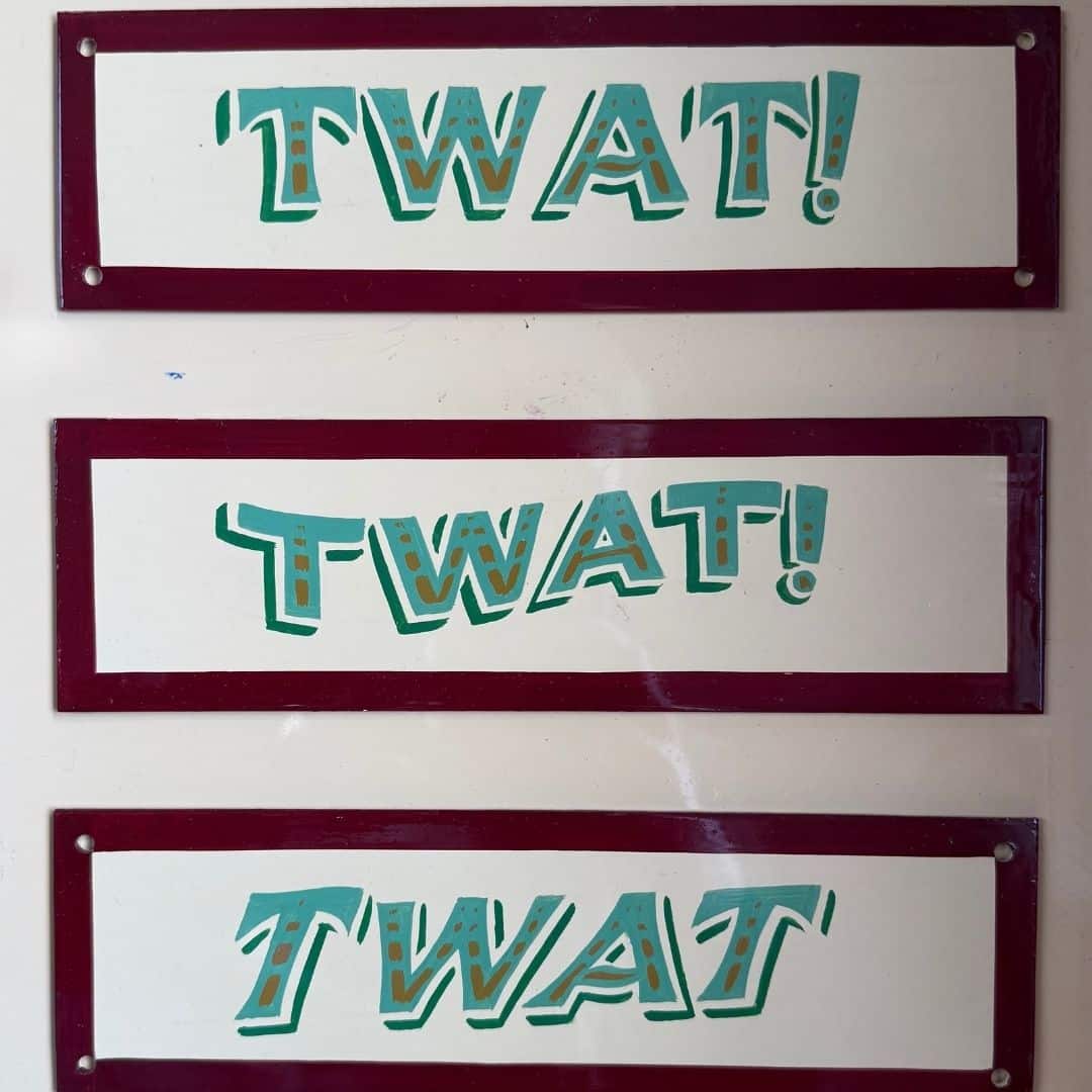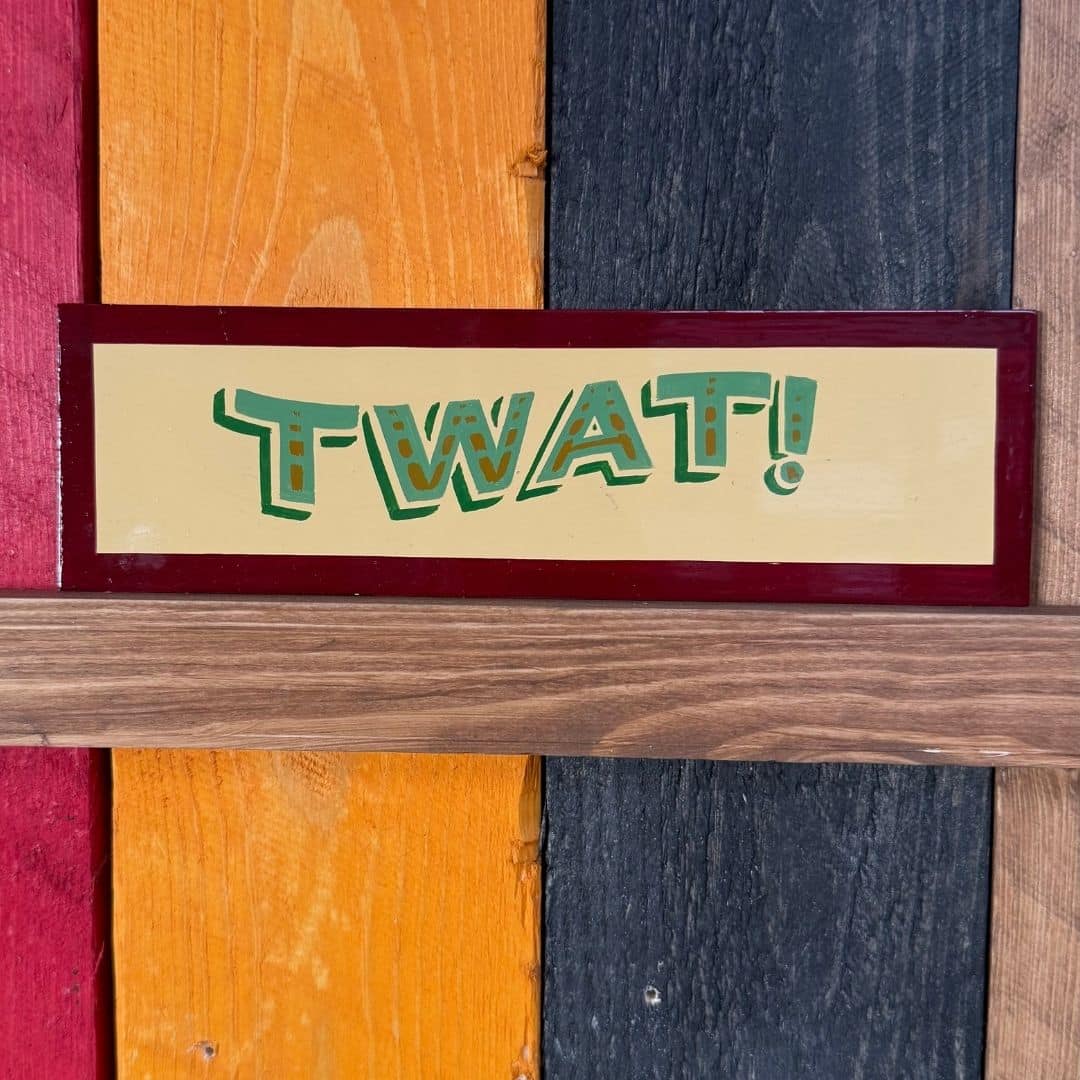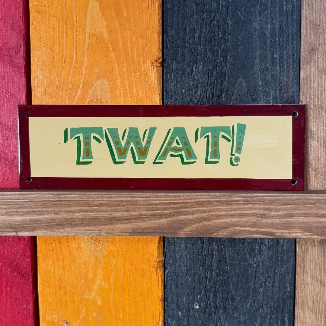 Hand-painted by Joby in a bold fairground style, these cheeky ‘TWAT’ signs are designed purely for fun. Right colours, crisp lettering and a classic stepped away block that lifts the word right off the panel. Two of the signs are in Joby’s Tuscan Curveside and the other is Ship both of these can be found in his book All the Fonts of the Fair.